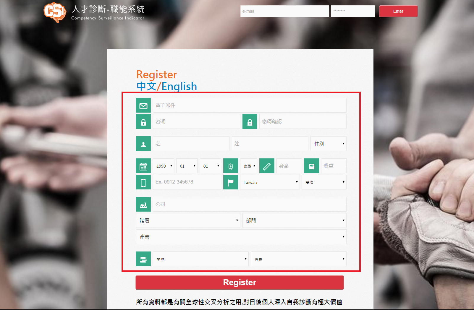 第二步、看到如下畫面後,請完整填寫紅色框中的欄位,填寫完畢後請點擊下方紅色(Register)按鈕